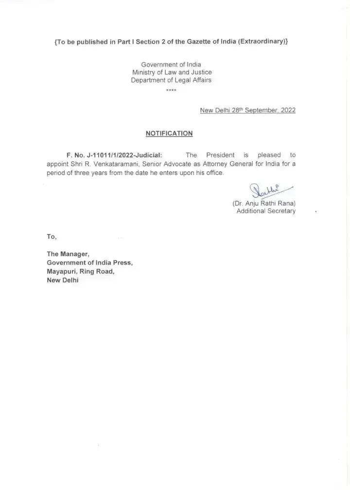 Honorable President is pleased to appoint Shri R. Venkataramani, Senior Advocate as Attorney General for India w.e.f. 1st October 2022.